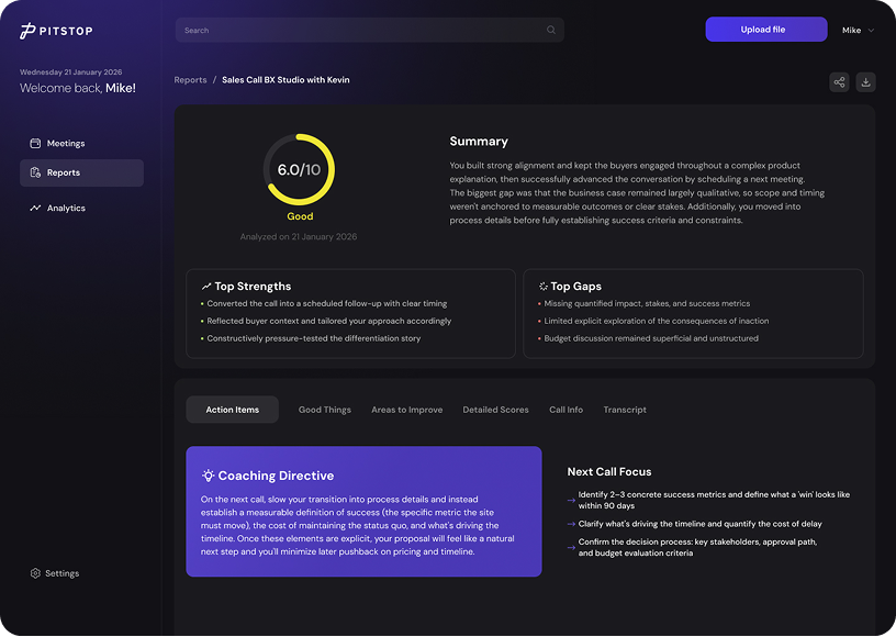 This is not coaching layered on top of calls. It is execution management during a high-stakes launch. Pitstop delivers guidance while deals are still live, not weeks later when execution drift has already compounded.