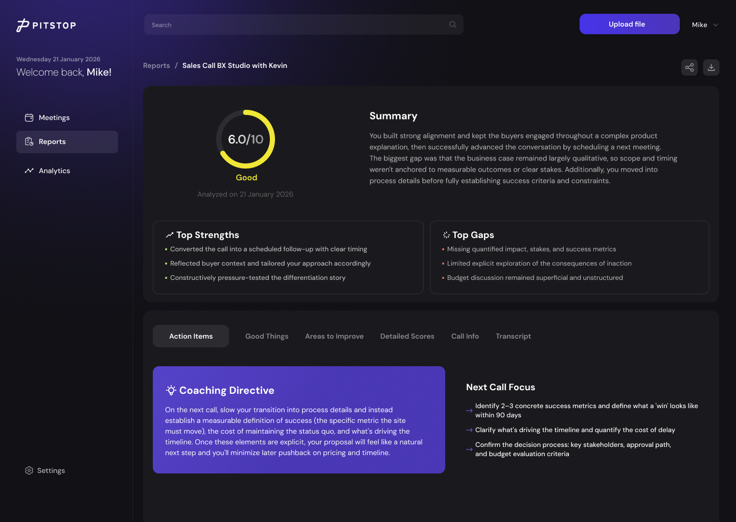 Upload your sales calls right now. No credit card. No commitment. In seconds, Pitstop's AI coaches analyze your team's real execution and show you: